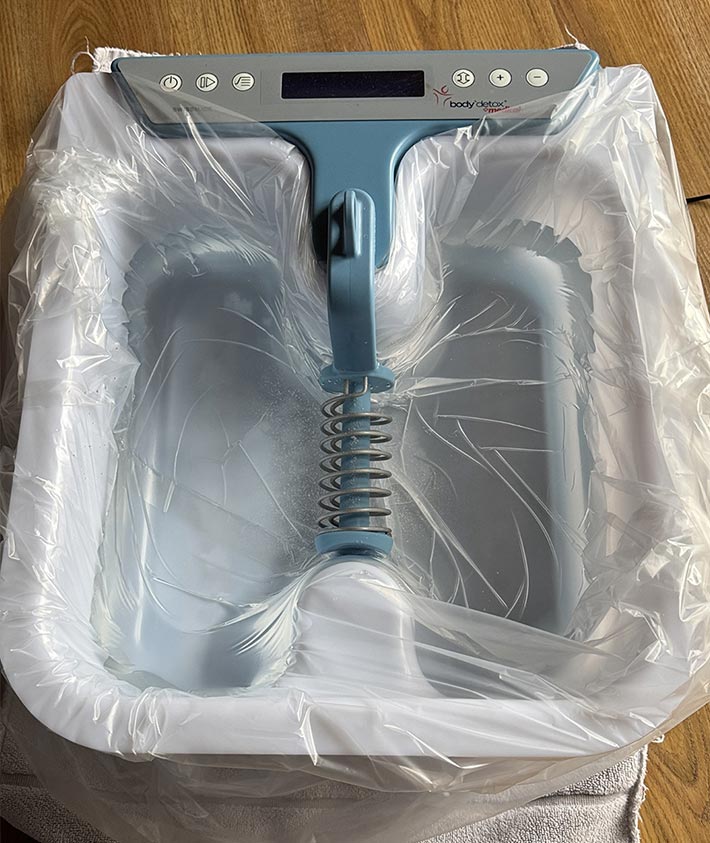 Im ionisierten Fußbad werden über Elektrolyse negativ geladene Ionen erzeugt, die mit über die Fußsohlen mit dem Körper in Resonanz treten. Diese negativ geladenen Ionen binden im Körper positiv geladene Schadstoffe und neutralisieren sie, so dass sie über Haut, Nieren, Lunge und Darm in den folgenden 24-48 Stunden ausgeschieden werden. Die Zellen im Körper werden somit elektrisch revitalisiert, die Körperflüssigkeiten werden gereinigt und aktiviert, um den Körper als Transport und Reinigungsmittel wieder zu unterstützen.